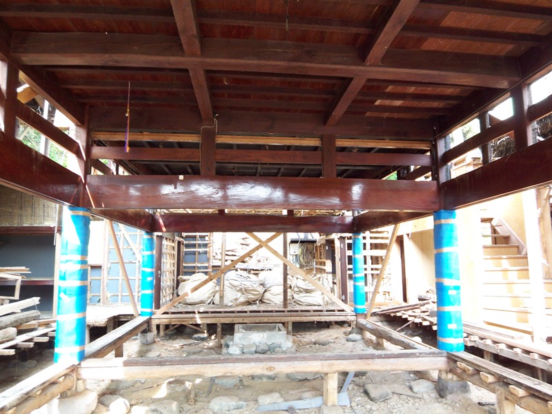 この枠の内を中心に各構造材を取り付けしていく為、この後は仕口加工を施さなければなりませんが、一先ず枠の内の移動は完了しました。職人の皆さんお疲れ様でした。 |