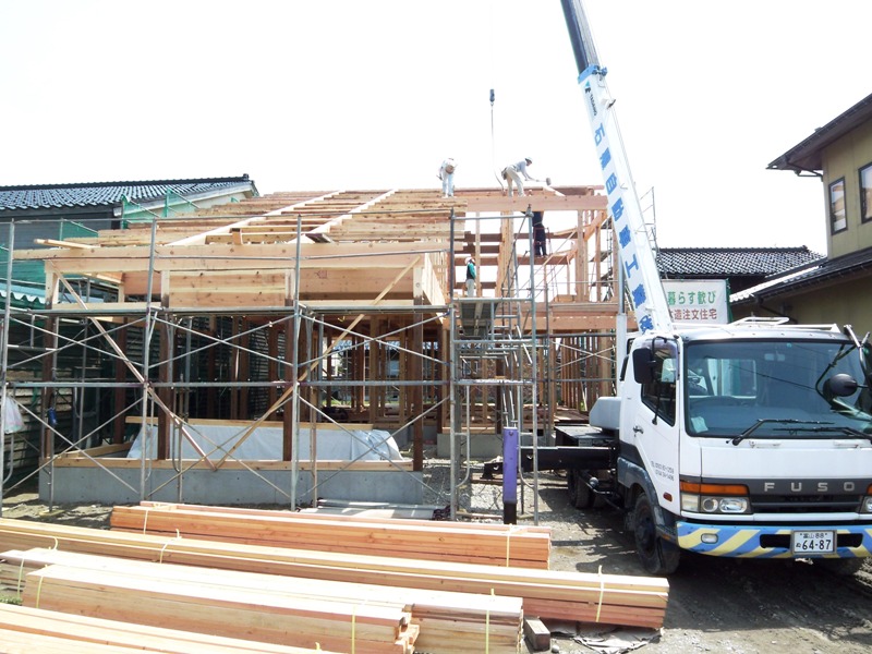 上棟 いよいよ棟木の組付けです!お客さんが見逃してはならない瞬間ですね。ちゃんと連絡して観て頂きました。 棟木も例に漏れず1本物です。 |
